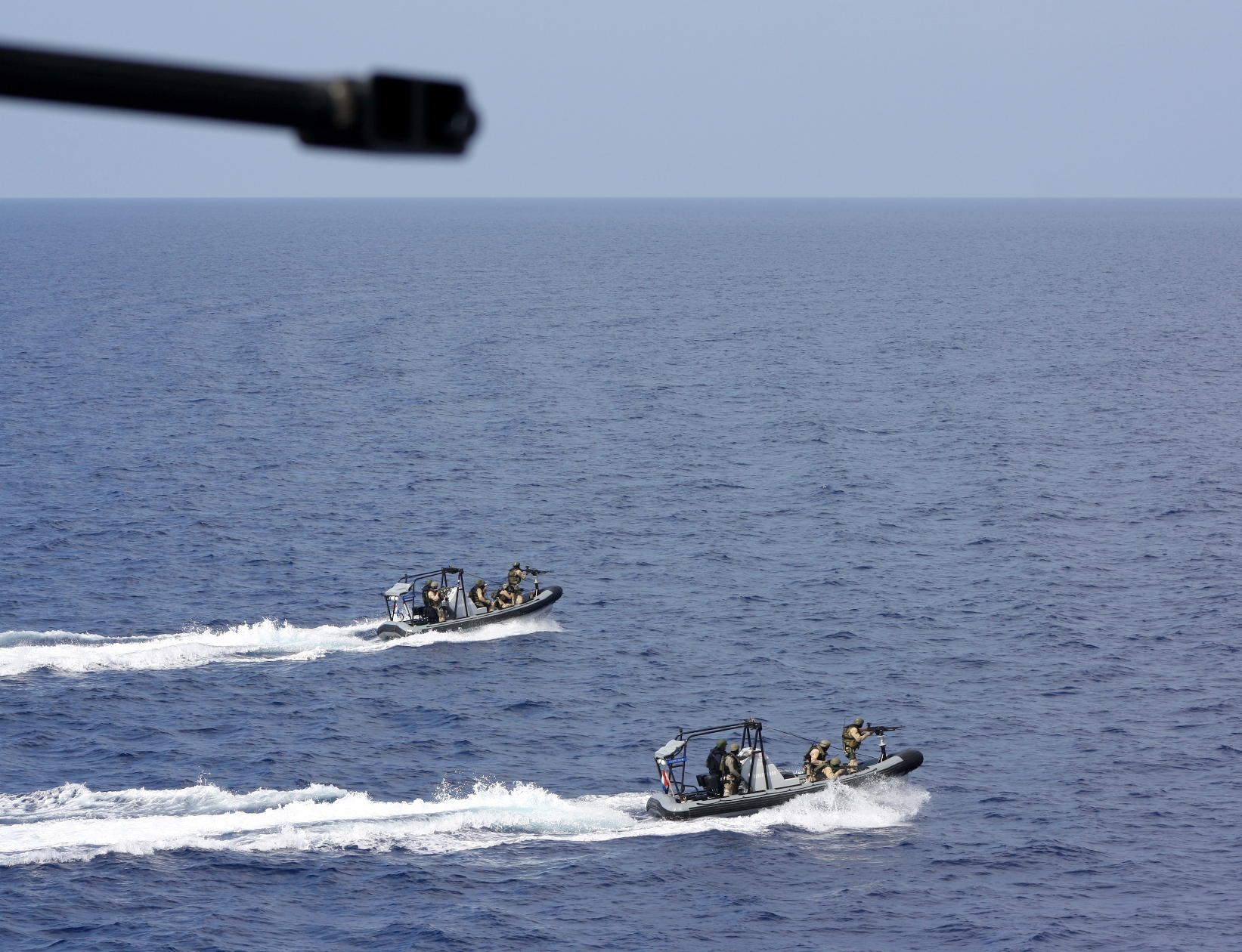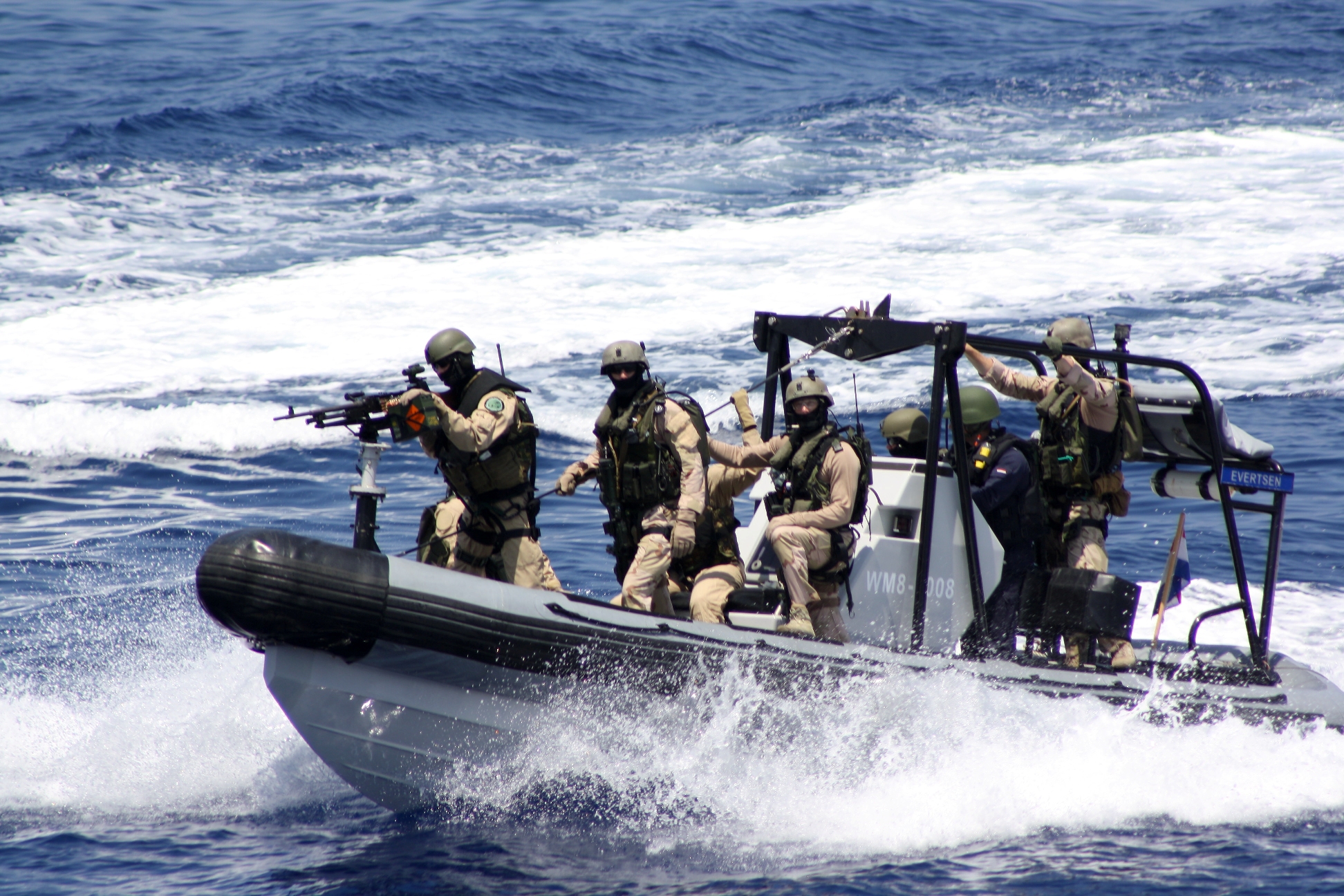 HNLMS Evertsen participated in EUNAVFOR’s Operation ATALANTA in 2009; in one operation her crew were responsible for capturing thirteen Somali pirates who had previously attempted to board the BBC Togo off the coast of Oman. In 2010, HNLMS Tromp took part in Operation ATALANTA, including the retaking of the German flagged MV Taipan by Dutch marines. Evertsen has returned to the Horn of Africa as the Netherlands’ contribution to NATO’s Operation Ocean Shield, under the command of Commander Boudewijn Boots, and serves as the flagship of Ocean Shield for Commodore Ben Bekkering, current Commander SNMG1 (Standing NATO Maritime Group 1), and his international staff of 24. She has been involved in several successful counter-piracy actions, including detaining Somali pirates who had hijacked an Omani dhow and its crew, and used the vessel to attempt to board the MV Namrun. The Evertsen carries a Royal Netherlands Marine Corps Enhanced Boarding Element (EBE) as part of its counter-piracy capability. The EBE is made up of operators from the Royal Netherlands Marine Corps Maritime Special Operations Forces (MARSOF), assigned to the vessel for counter-piracy duties. It may also be supplemented by regular marines.