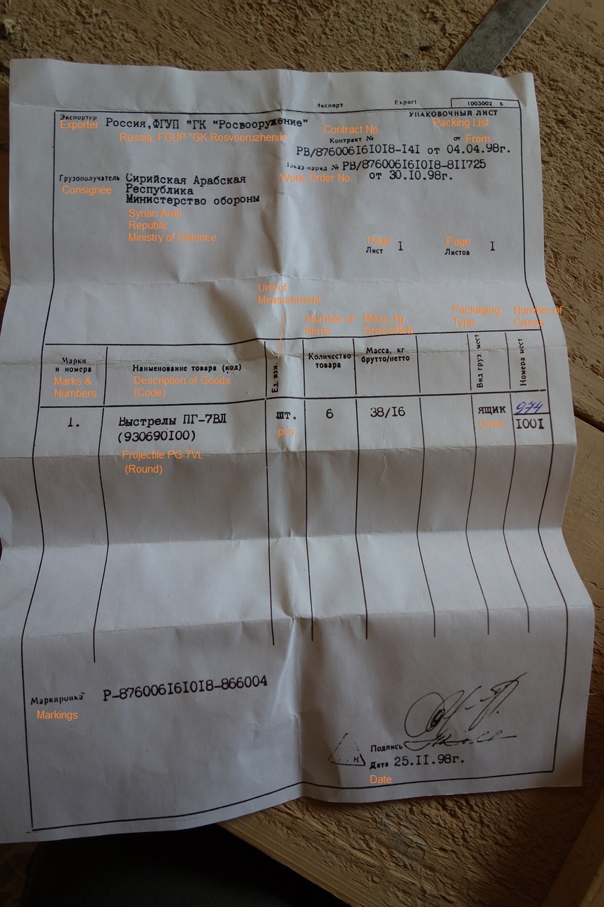 The projectile at right in the image above is a PG-7VL HEAT round, introduced by the Soviet union in 1977 as a further improvement to the earlier PG-7VM (1969) and PG-7VS (1972) projectiles. The PG-7VL is 93mm in diameter, weighs approximately 2.6kg, and contains 730g of OKFOL explosive compound. It is capable of penetrating more than 500mm of RHA, or 1.1m of reinforced concrete. It is primarily intended for use against armoured targets, but the significant quantity of explosive material means that it is an effective weapon for engaging field emplacements or light structures. The photo above comes from a series of images purporting to show captured materiel sent from Libya and intended for the FSA  [Note: this is a known pro-Assad government website]. These projectiles did not actually make it into Syria, however others most certainly did. The shipping document below, photographed by C.J. Chivers in Jebel al-Zawiya last month, describes the delivery of a case of six PG-7VL projectiles from the Russian state-owned GK Rosvooruzhenie (the precursor to today’s JSC Rosoboronexport) to the Syrian Ministry of Defence, in November 1998. The document refers specifically to case 974/1001. Were all 1001 cases to contain PG-7VL projectiles packaged in the same manner, the contract may have been for over 6,000 rounds. I have annotated the document with English translations, as provided to me.