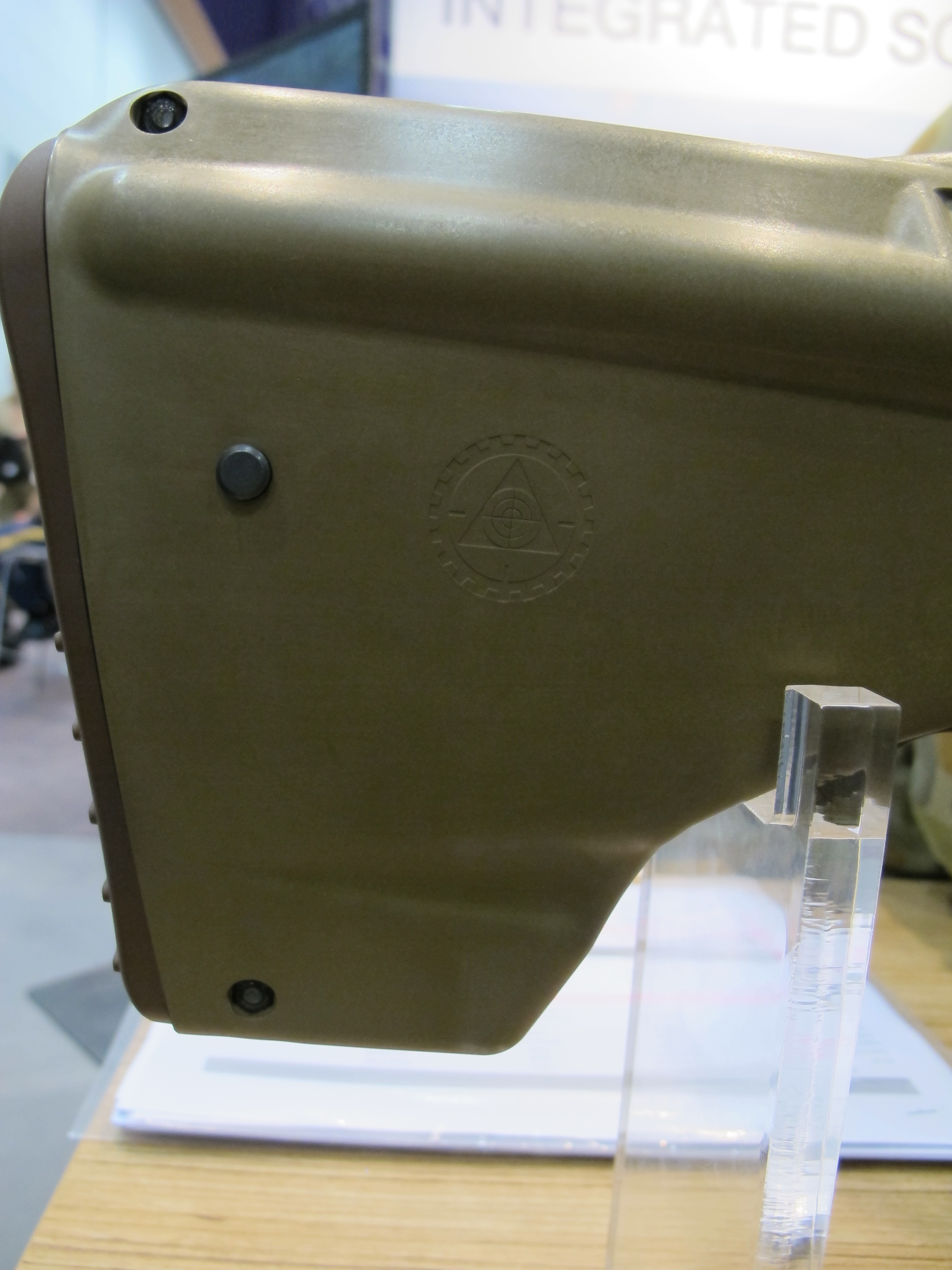 Many of you following the blog will know I’ve been keeping close tabs on the Thales Australia EF88 assault rifle, being developed under the Land 125 Phase 3C program. I have written a review of the rifle which can be found in Issue 4 of On Duty Magazine, out this month. The rifle can be seen above in its latest iteration, being featured at Land Warfare Conference 2012, which I recently attended in Melbourne. The Madritsch ML40AUS grenade launcher has been finished in a two-tone paint scheme that corresponds with that of the rifle, and Defence have asked that Thales add the optional bolt catch release they were offering with the F90. The rifle is seen here with the ‘Tier 3’ sight Thales intends to offer Defence, a Trijicon TA44SR-10 1.5×16 ACOG.
