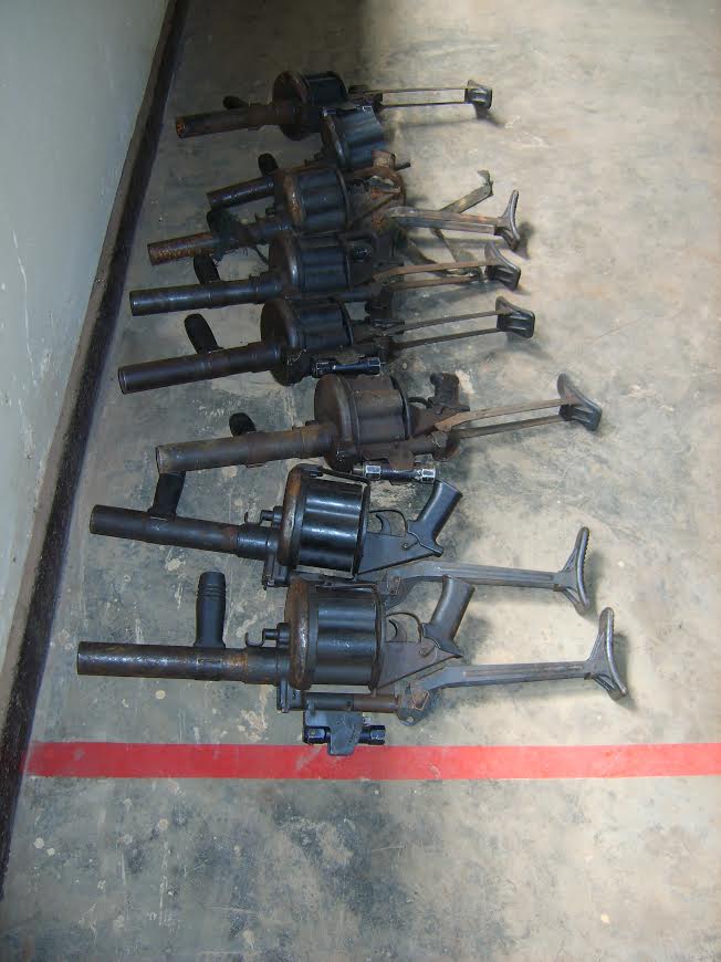 A quick post to point out what appears to be a Milkor MGL Mk.1 grenade launcher, seen here in the hands of Séléka fighters near Bangui, in the Central African Republic (CAR). The Milkor MGL is a South African six-shot rotary grenade launcher, designed by Andries Piek of Milkor (Pty) Ltd. and introduced into service with the South African Defence Force in 1983. I’ve since seen two more examples in CAR. In the background, we can also see a rather rusty South African R4 rifle. Whilst it is entirely possible these were taken from South African forces stationed in CAR, Milkor MGLs have been found throughout the broader region. 48 Milkor MGLs were destroyed by Mines Advisory Group in Rwanda in 2009, including those in the image below.